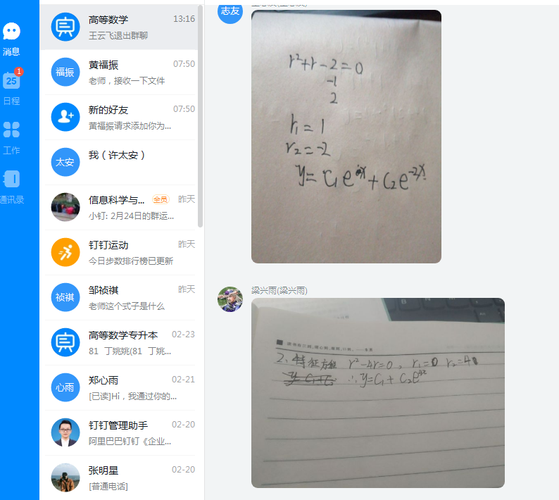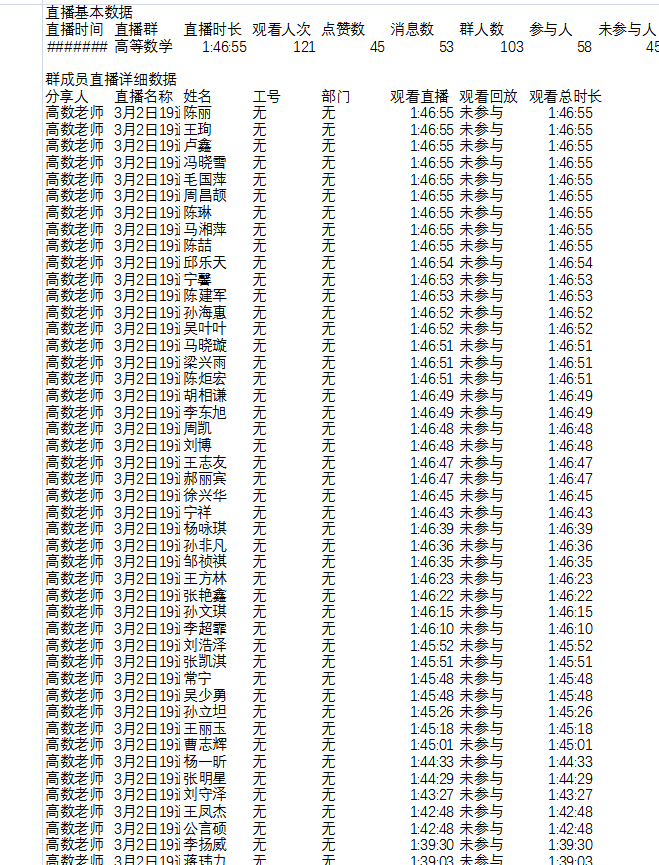 为了迎接2月17日早上3-4节的高等数学第一堂直播课,两周前就开始制定在线教学计划、考核标准、课程说明、建议学生的学习流程等。为了保证教学质量,提前在班级微信群和在线教育综合平台进行发布,同时还公告了拟定的线上线下的混合新教学模式,并将教材电子版、课外练习题及参考答案、精选慕课等教学资源提前分享给学生,用于学生线下课前预习以及课后温习课程内容。