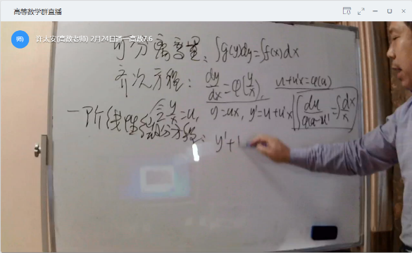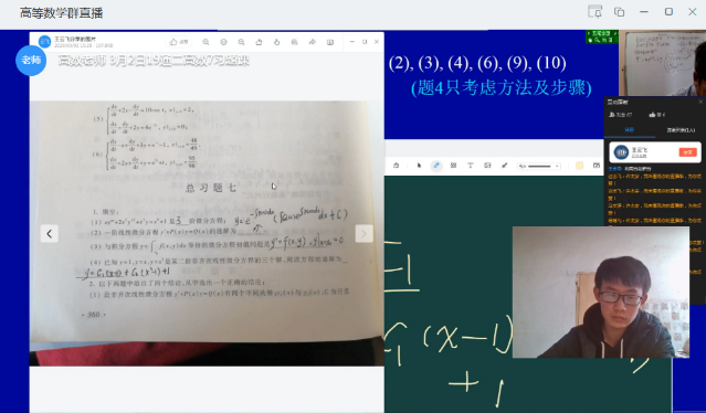 《高等数学》是理工科基础理论课,定义定理以及公式推导多,内容比较枯燥,采用线上教学难度系数大。如果一味将知识讲解用于PPT播放,高等数学很难达到效果。如果让学生像在课堂一样跟随老师的思维进行推理,板书是重要的一环。为此,许太安老师专门购置了一块白板,上课时定义、定理的推导也与教室内上课一样进行推导及板演,目的在于准确表达出知识间的逻辑关系,在掌握基本知识的前提下,突出章节的重点和难点,将较为枯燥的理论知识在网络直播课堂上与同学进行互动。