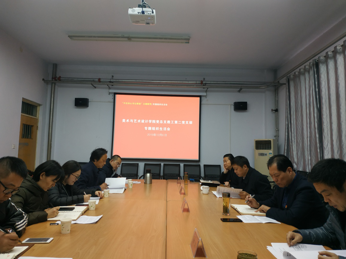 12月6日下午,美术与艺术设计学院教工第二党支部“不忘初心、牢记使命”专题组织生活会在美术楼5112会议室召开,副校长李目海和支部全体党员参加了会议,会议由党支部书记邢军主持。