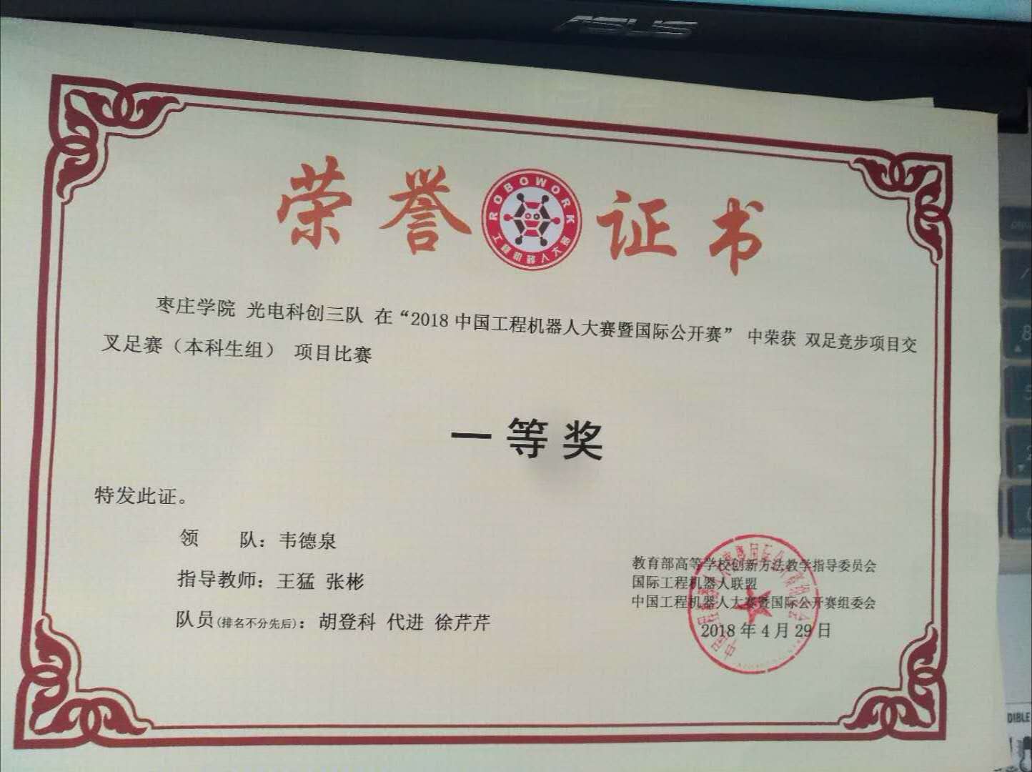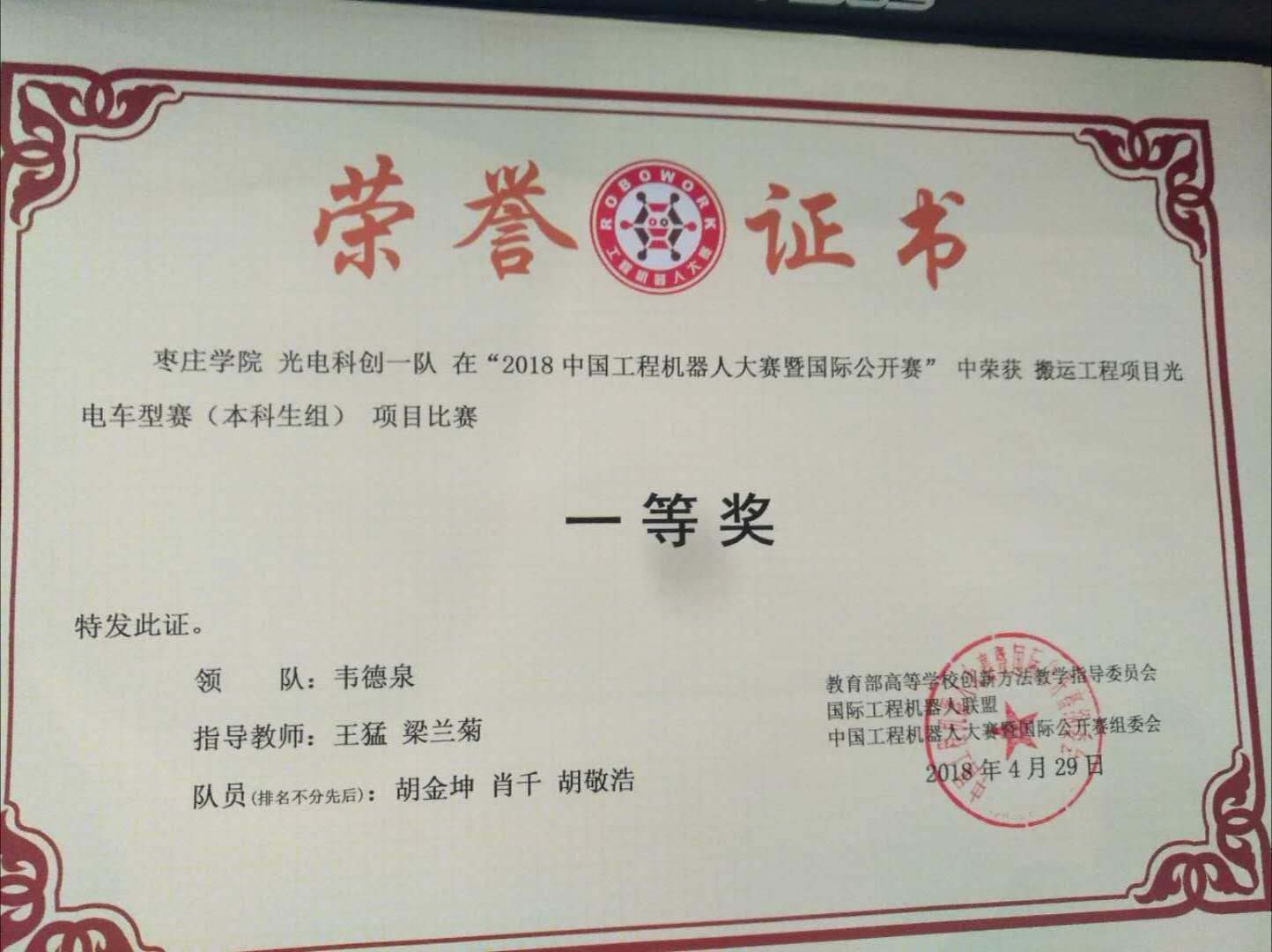 2018中国工程机器人大赛暨国际公开赛于4月25-29日在湖北省武汉市中国地质大学举行,本届大赛由教育部高等学校创新方法教学指导委员会等单位联合举办。我校光电工程学院派出的3支代表队共获得国家级一等奖2项、三等奖1项。