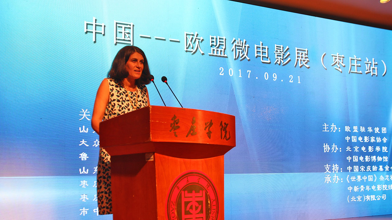 西班牙驻中国大使馆文化参赞格洛丽塔女士致辞。她说,微电影展关注年轻的电影制作者和他们独特的拍摄方式,在推动中国和欧盟间的文化交流上将会发挥巨大的潜力。微电影虽然在主流文化中处于边缘地带,无法同投资巨大的商业大片相抗衡,但仍有一线曙光。它可以以不同的方式来呈现不同的影像,讲述不同的故事,展现不同的面孔,为那些无法发声的人们提供展示才华的机会。影展帮助这些年轻的创作者们在事业发展上更进一步,也有助于我们跨越语言和文化的障碍,增进东西方的友谊,促进中国和欧盟间的友好关系。我们共同希望能为实现这一目标做出自己的贡献。