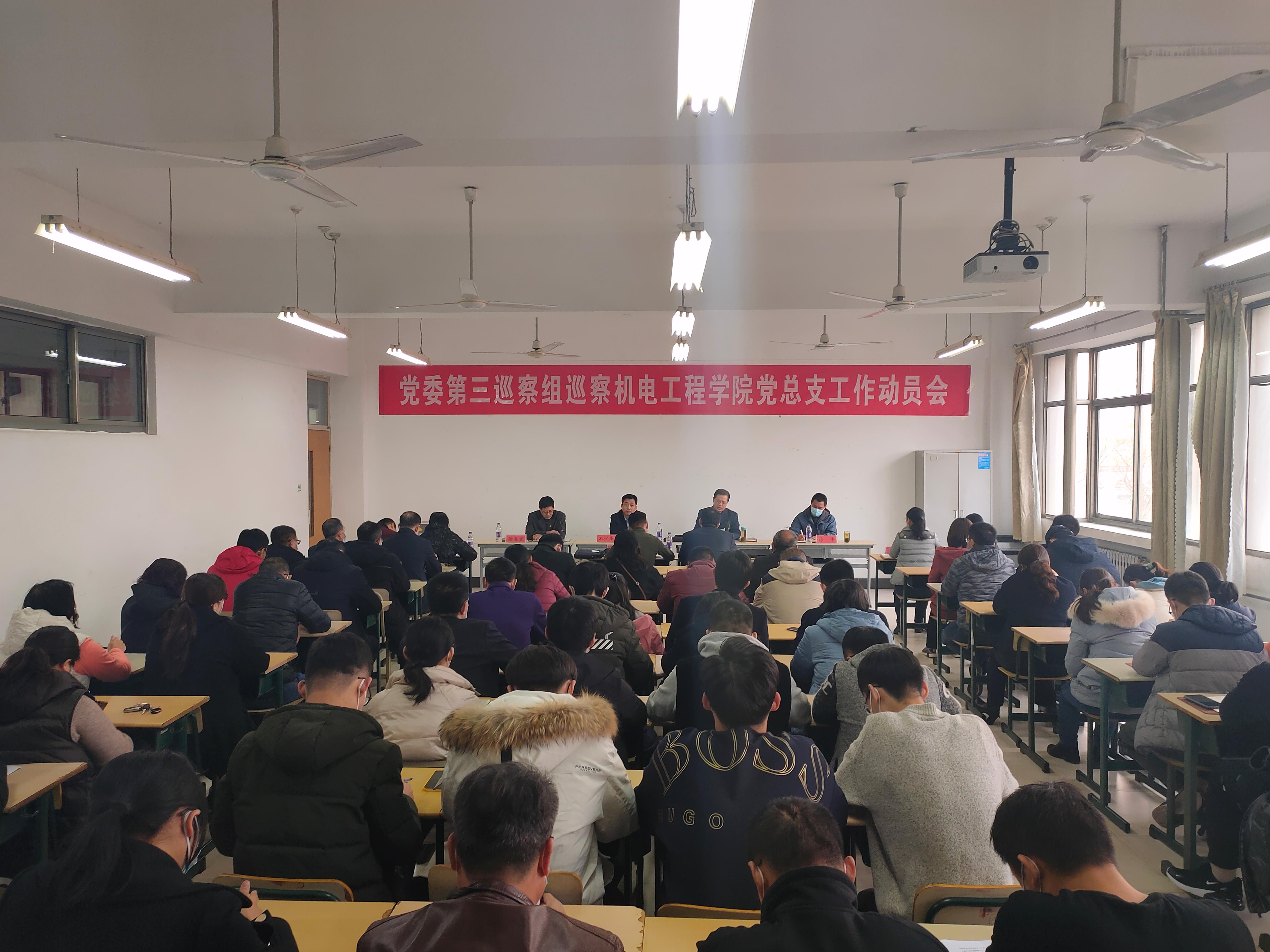 根据学校党委开展第三轮校内巡察和意识形态工作专项巡察的统一部署,11月24日下午,党委第三巡察组巡察机电工程学院党总支工作动员会在理工楼2420教室召开。党委巡察工作领导小组成员、纪委副书记、正处级监察员石少华代表学校党委讲话,党委第三巡察组组长郑付海对巡察工作进行动员部署,机电工程学院党总支书记徐春堂主持会议并作表态发言。党委第三巡察组全体成员,机电工程学院领导班子成员、全体教职工、学生党员代表共60余人参加会议。