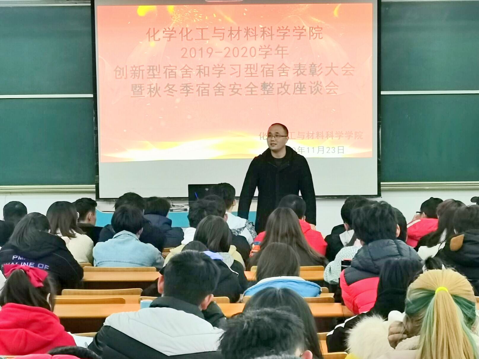 11月23日晚,化学化工与材料科学学院在综合楼1214召开2019-2020学年创新型宿舍和学习型宿舍表彰大会暨秋冬季宿舍安全整改座谈会,2018、2019、2020级各宿舍舍长和各班宿管委员共计200余人参加。