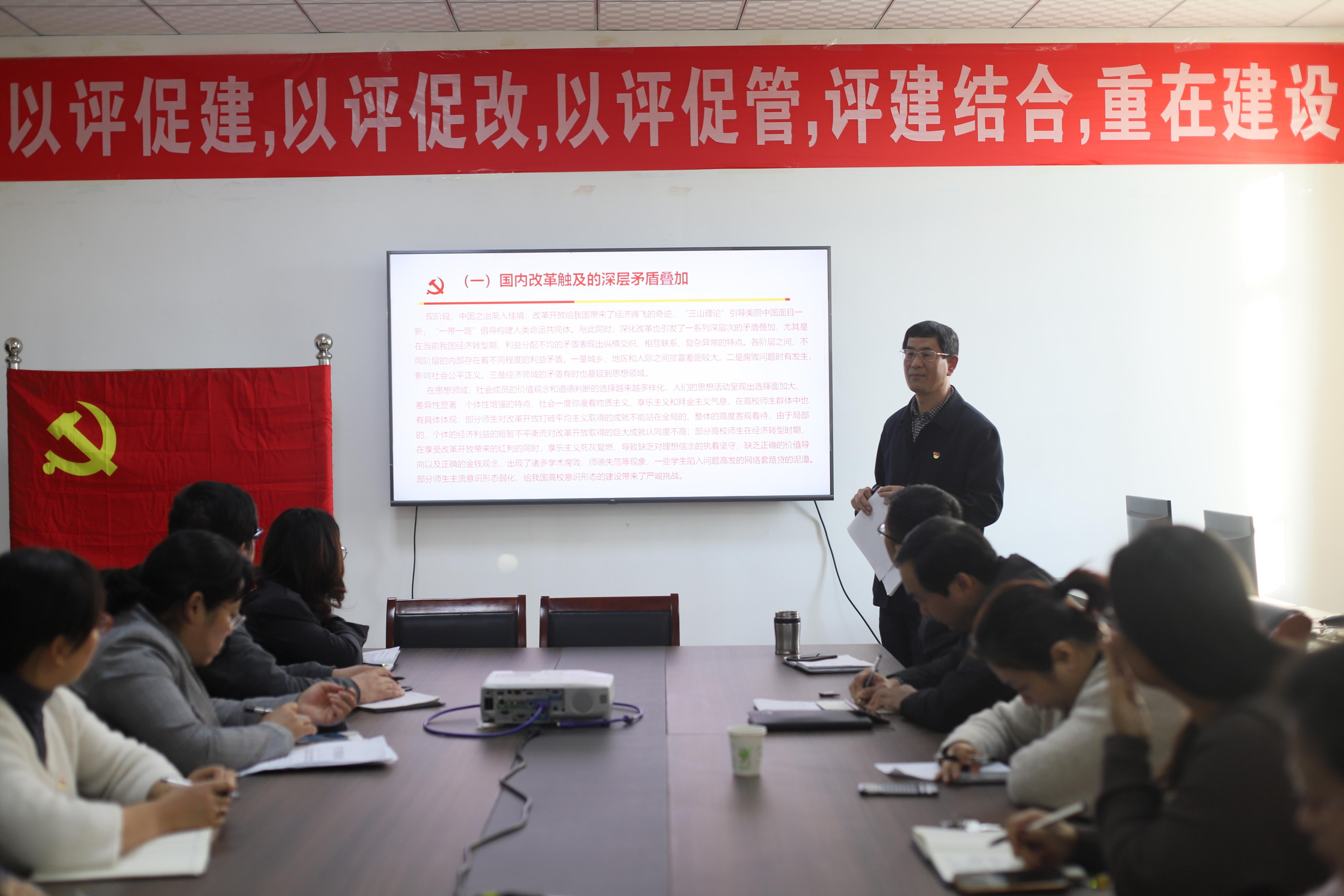 10月23日下午,外国语学院在文科楼309会议室开展意识形态专题党课教育活动,专题党课由学院党总支书记刘玉宝主讲,题目为《增强思想自觉和行动自觉,积极探索加强新时代高校意识形态安全建设的路径选择》,外国语学院部分教工党员和全体学生党员参加了此次专题党课教育活动。