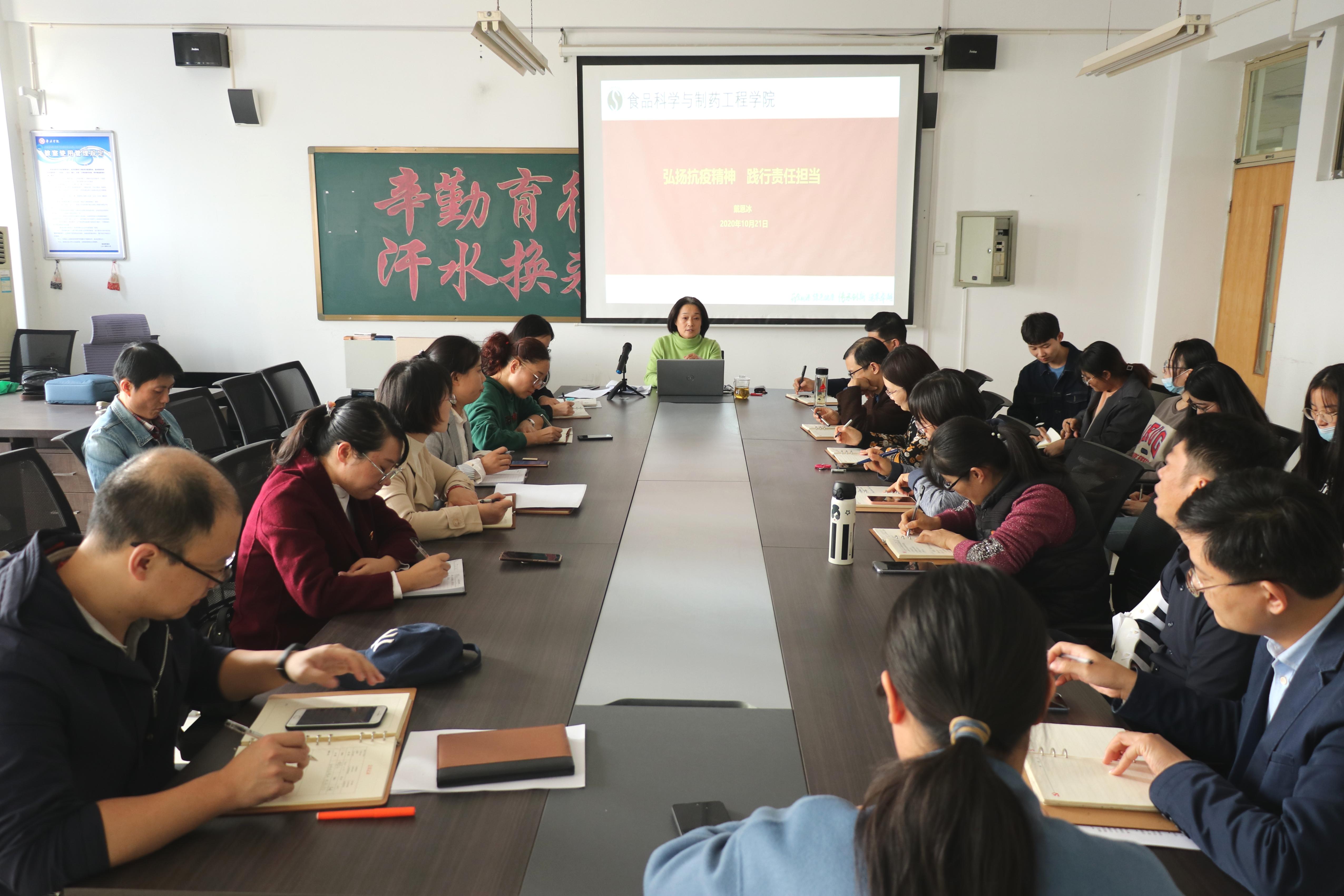 10月21日下午,食品科学与制药工程学院在理工楼2301教室举办“弘扬抗疫精神,践行责任担当”专题党课,院党总支书记戴恩冰担任主讲,学院全体教工和学生党员参加党课学习。