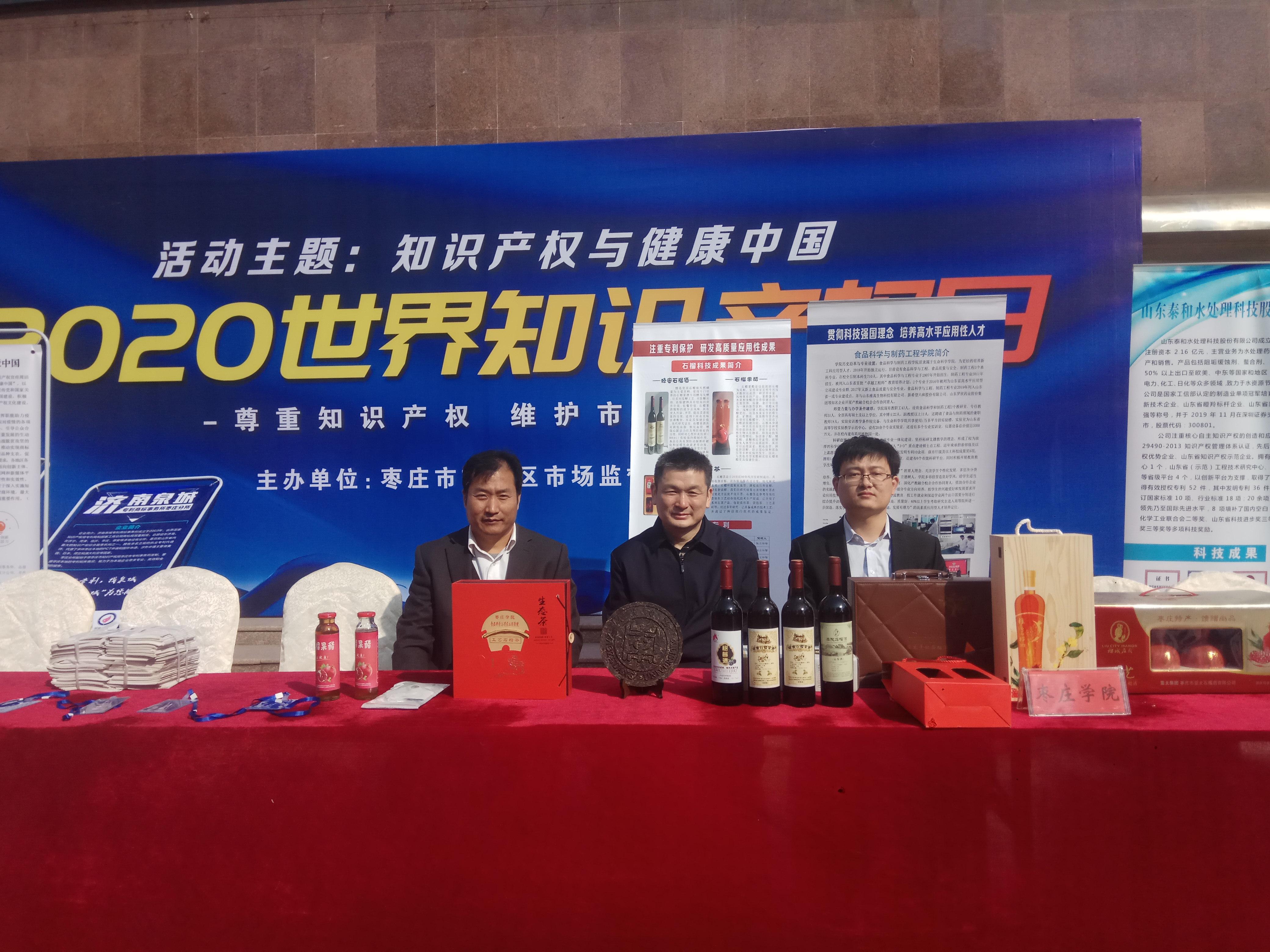 4月26日,枣庄市市中区市场监督管理局在中央广场举办了主题为“知识产权与健康中国”的世界知识产权日宣传活动。香港全年最全免费资料大全科技处副处长闫昕、食品科学与制药工程学院副院长张立华以及王京龙、李松涛老师一行四人应邀参加了此次活动。活动现场,学院展示的石榴酒、石榴醋、石榴茶、石榴籽油软胶囊、清肺防霾口罩等专利产品,受到了广泛关注和好评。