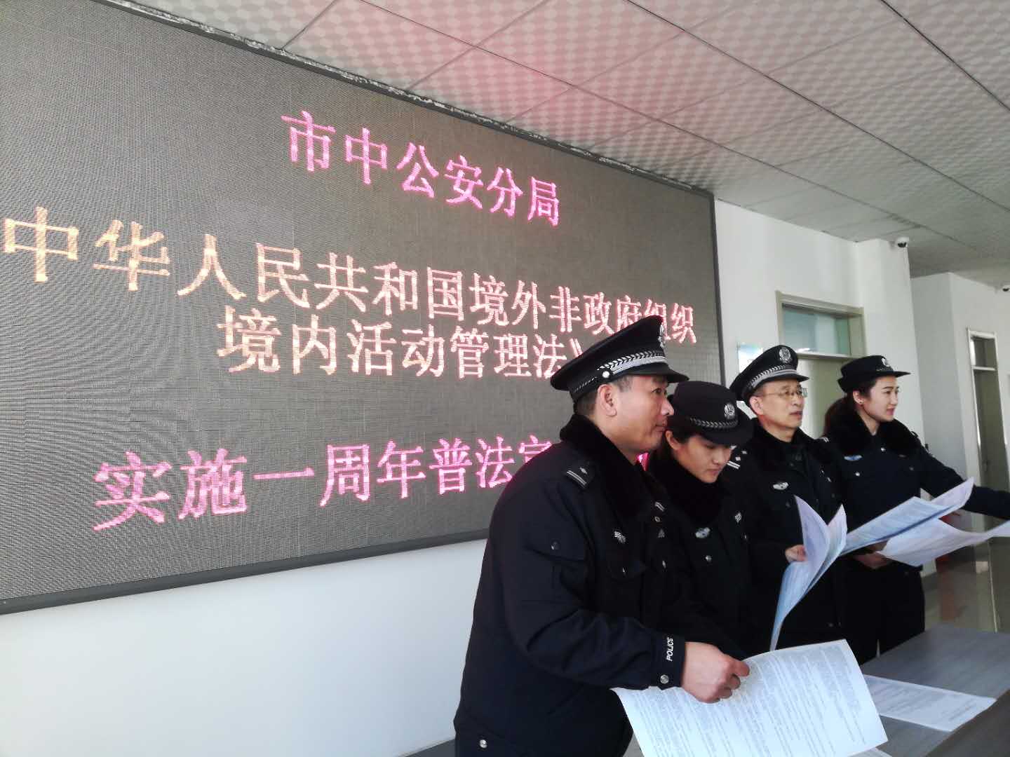 1月9日上午,值《中华人民共和国境外非政府组织境内活动管理法》实施一周年之际,保卫处联合市中公安分局在大学生活动中心举行宣传活动。市公安局国保支队副支队长吕浩玉,市中公安分局国保大队大队长孟勇、副大队长赵振传,渴口派出所副所长孙飞等与我校100余名师生代表参加活动。