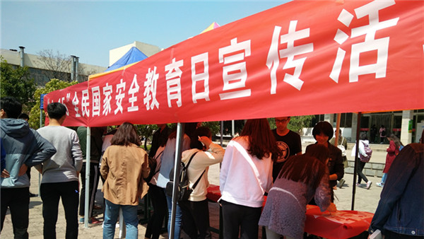 为迎接我国第二个全民国家安全教育日的到来,4月13日,由校团委、学工处、保卫处主办,政治与社会发展学院承办的“4•15”全民国家安全教育日宣传活动在学校小广场举行。