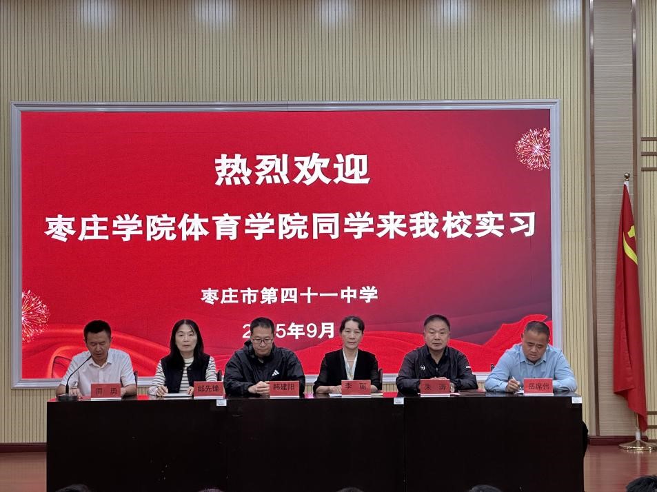 枣庄市第四十一中学执行校长朱涛介绍了学校的办学理念、校园文化及整体发展概况,鼓励实习学生珍惜教育实践机会,积极向校内指导教师学习,在实践中提升教学能力与职业素养。随后,四十一中体育组分管主任详细介绍了学校体育教学的具体情况,包括课程设置、课外活动开展、体育赛事组织及师资队伍建设等内容,为实习学生快速熟悉教学环境、融入教学工作提供了清晰指引。