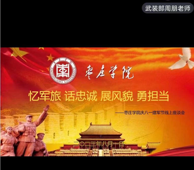 为庆祝第九十六个建军节,提高我校学生的爱国热情,8月1日上午,学生工作处(武装部)开展以“忆军旅、话忠诚、展风貌、勇担当”为主题的八一建军节线上座谈会。我校优秀退役士兵大学生、退役毕业生、现役士兵及校文明自律委员会学生干部参加了此次活动。