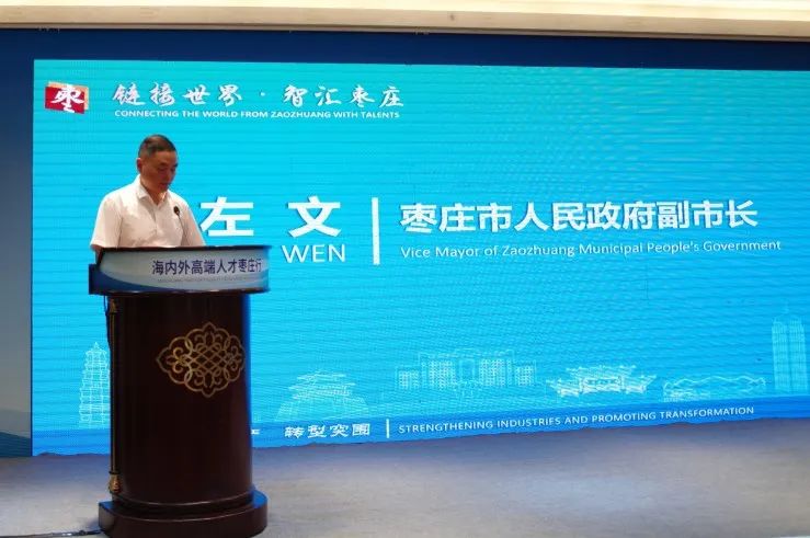 左文在致辞中指出,工业倍增、转型突围的实现,离不开创新的驱动、科技的引领和人才的支撑。此次海内外高端人才枣庄行活动通过实地参访、专题推介、主旨发言、专家讲座等多元立体、务实高效的形式,有效促进高端人才与我市在人才交流、项目对接、科技创新等方面的深度合作,必将为枣庄发展提供强大技术和人才支撑,为实现工业倍增注入强劲动力。希望各位专家把枣庄作为重要合作伙伴,推动更多高端人才向枣庄汇聚、更多科研成果在枣庄转化,枣庄市将进一步加大政策支持和政务服务力度,全力以赴为各位专家人才在枣庄创新创业营造一流环境。