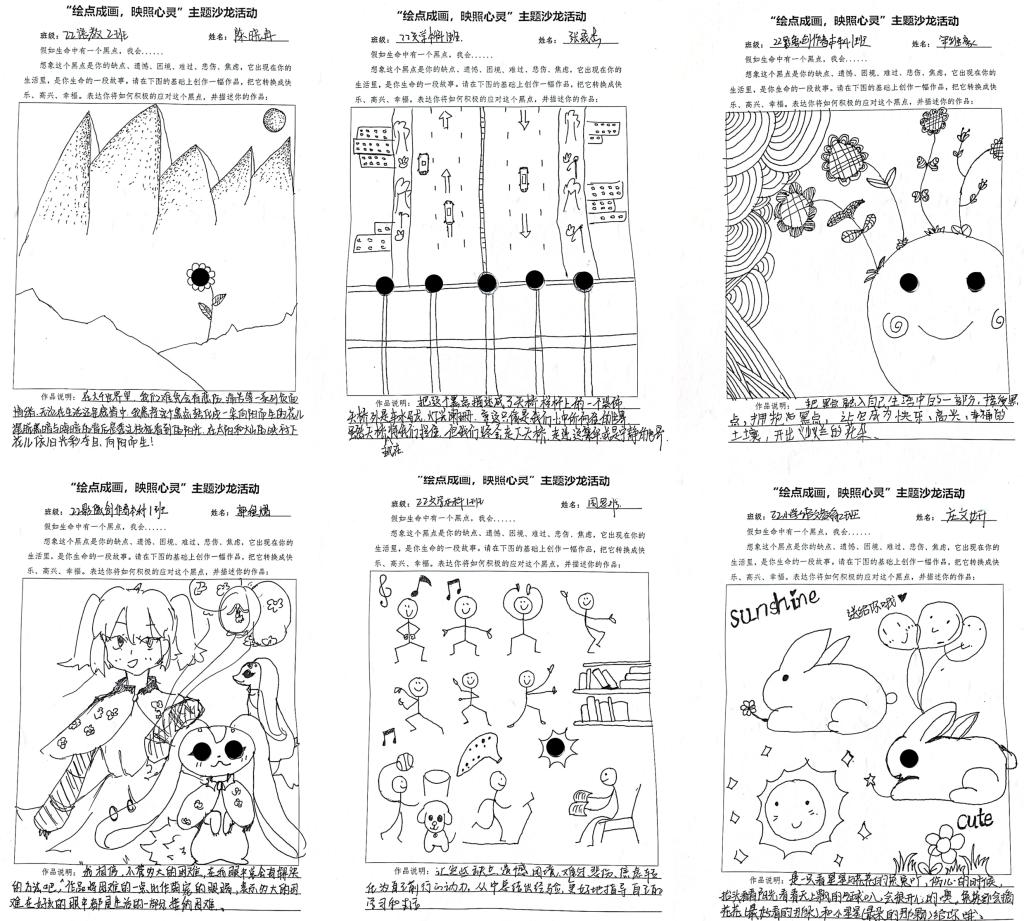 本次活动,从2021、2022级抽取部分不同性格的同学,以“假如生命中有一个黑点,它们代表缺点、遗憾等,如何在此基础上,转换成快乐与幸福”为题,在舒缓的背景音乐下同学们以自己的所思所想所悟进行创作,通过点线面等艺术表现形式将思想具象化到纸面上。在互动环节中,同学们通过分享彼此画作的创作理念,更好的了解了性格迥异同学们的多角度思维方式,更多面化的认识了自己。正如同学们的作品中所述“走过阻碍前行悲伤难过的天桥,我们终会走进向往的宁静或繁华的世界。”