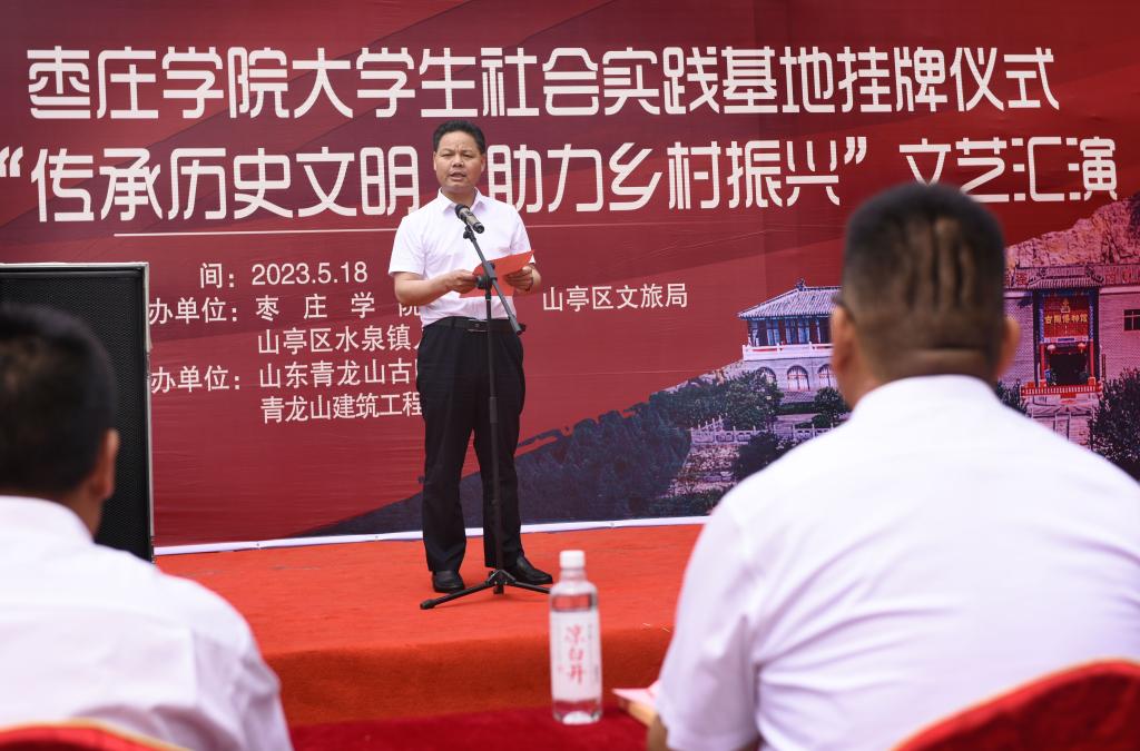 最后,山亭区文旅局局长徐伟上台致辞。徐伟表示,校外社会实践基地的成立为青年学子们提供了一个习得劳动技能和淬炼品德的机会,希望以此次签约挂牌为契机,搭建起学校和社会合作的服务平台,逐步打造“校地联手、自主互动、共建共享、合作发展”的社会实践教育基地品牌,为推动山亭区乡村振兴贡献枣院力量。