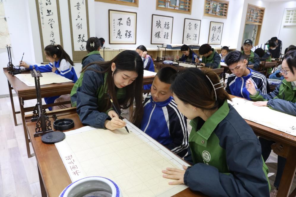 活动伊始,支教大学生张雪菲仔细讲解了软笔书法的握笔姿势、运笔方法、书写技巧以及“永字八法”。大家都被生动有趣的课堂深深吸引着,用苍劲有力的笔锋书写着中华优秀传统文化。随后,学生们一起观看了硬笔教学视频,学习正确的握笔姿势和书写方法。疏勒二中校长谈涛和党总支副书记李成刚莅临现场进行指导。最后,支教团大学生和中学生们一起,根据自己的兴趣喜好进行创作,他们相互交流、共同创作、取长补短、彼此欣赏,纸笔间流转着源远流长的中华文化。