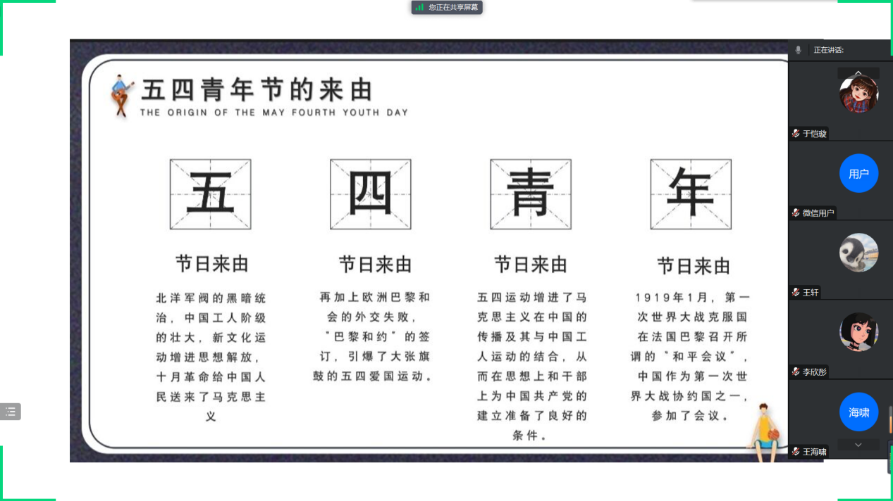 本次学习活动由学院辅导员联合班团两委采取线上线下结合的方式开展。各班团支书精心准备,通过视频、图片、PPT等形式,详细阐述了开展本次活动的意义所在,介绍了五四青年节的来源,着重学习了习近平新时代中国特色社会主义思想主题教育及习近平给中国农业大学科技小院学生的回信等内容,同时也希望同学们志存高远、脚踏实地,把课堂学习和乡村实践紧密结合起来,为加快推进农业农村现代化、全面建设社会主义现代化国家贡献青春力量。