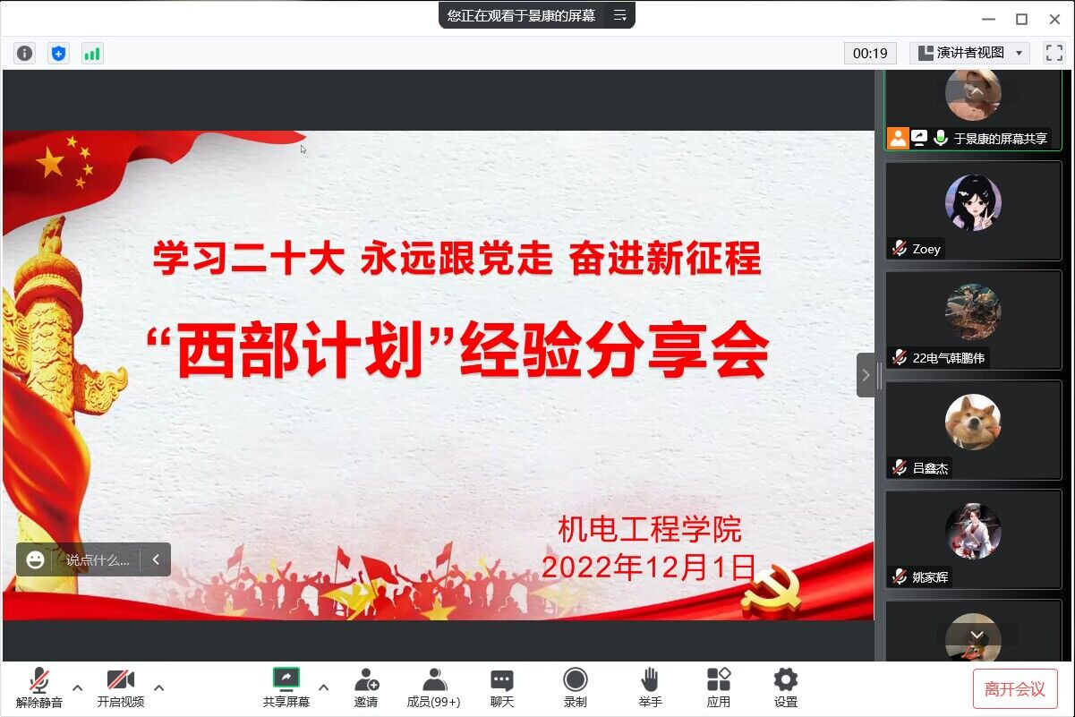 12月1日晚,机电工程学院召开“西部计划”经验分享会,深入学习宣传贯彻党的二十大精神,号召更多的青年到基层到西部去受教育、长才干、做贡献。此次活动邀请学院2022届毕业生“西部计划”志愿者代表开展云宣讲,近200名同学参会。