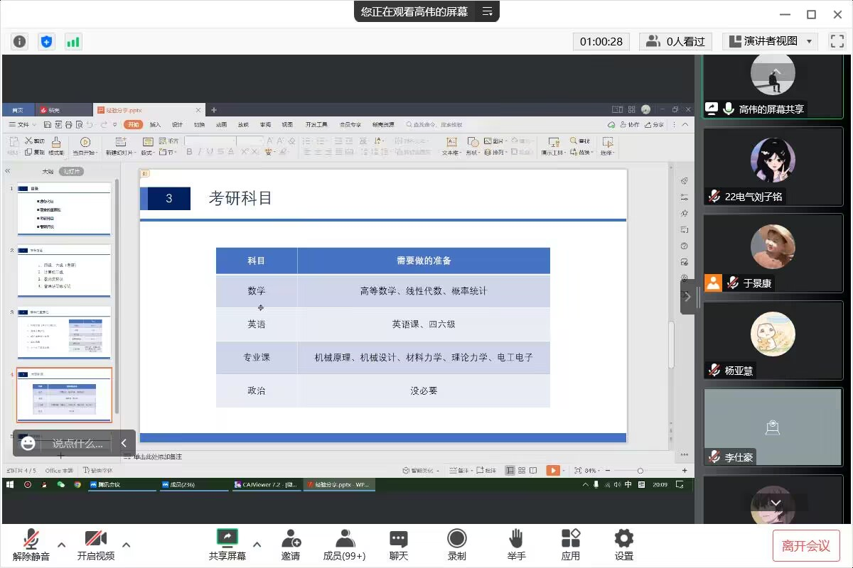 会上,四位毕业生代表依次讲述他们在校期间的学习方法、考研目标的确定、考研过程的筹备以及考研决策等问题,对低年级师弟师妹提出许多真诚中肯的学习建议。分享结束后,同学们就个人学习困惑和考研相关的难题踊跃提问,四位毕业生细心解答相关问题,为低年级同学的生涯规划和考研准备指点迷津、拨开云雾,具有很大的启发作用。最后,主持人老师提醒同学们对于四位师哥师姐的分享,要充分吸收、早做准备、合理规划,并积极主动联系师哥师姐寻求帮助,传承机电工程学院的优秀传统。
