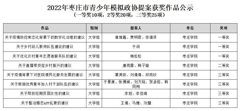 近日,2022年枣庄市青少年模拟政协提案活动落下帷幕,我校共有8份学生模拟政协提案入选,最终获得1等奖3项,2等奖1项,三等奖4项。