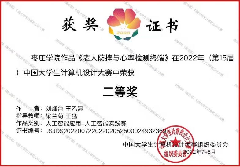 光电工程学院一直重视对学生的工程实践教育,积极鼓励学生参加各类科技竞赛,培养学生创新和实践能力。其中,在指导教师梁兰菊、王猛悉心指导下,学生刘烽台、王乙婷凭作品《老人防摔与心率检测终端》成功入围国赛,并最终荣获人工智能应用组的国家级二等奖。