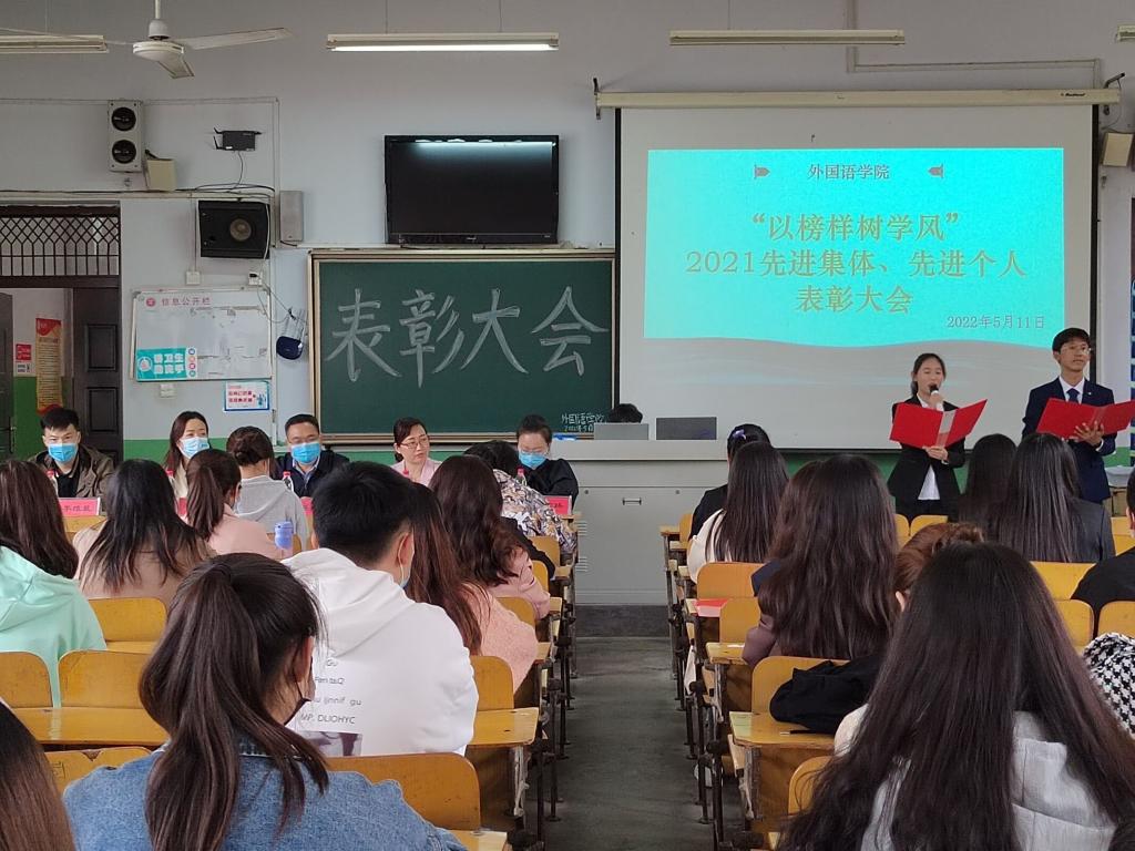 为鼓励先进、树立典型,促进学院学风建设工作再上新台阶,5月11日下午,外国语学院在文科楼101教室举办“以榜样树学风”2021年度先进集体、先进个人表彰大会。学院党政领导、全体辅导员、优秀学生代表参加了会议。