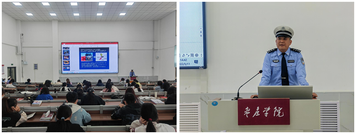 活动现场,薛城公安分局交警大队宣传科张裕秋警官用通俗易懂的语言,从道路交通安全法律法规着手,结合自己从警以来的道路秩序管理经验、当前交通安全形势以及如何提高大学生的安全意识等方面依次展开讲解,旁征博引,以翔实的数据、生动的事实讲述了交通事故造成的严重后果,告诉在场的每一位同学要深知严格遵守交通法律法规的重要性,交通安全关乎生命,珍爱生命从安全出行做起,良好的交通秩序需要每一位同学共同来创造。期间,民警向同学们讲解了日常出行乘车的注意事项和安全防范常识,告知同学们在日常外出驾驶电动自行车时一定佩戴安全帽头盔,拒绝乘坐“非法营运车辆”,保证自身安全,主动充当交通安全的践行者和传播者,提高遵守交通法规意识和自我保护能力,维护良好的校园交通环境。最后,通过观看事故监控视频这种直观的宣传方式,呼吁交通参与者珍爱生命,文明出行。