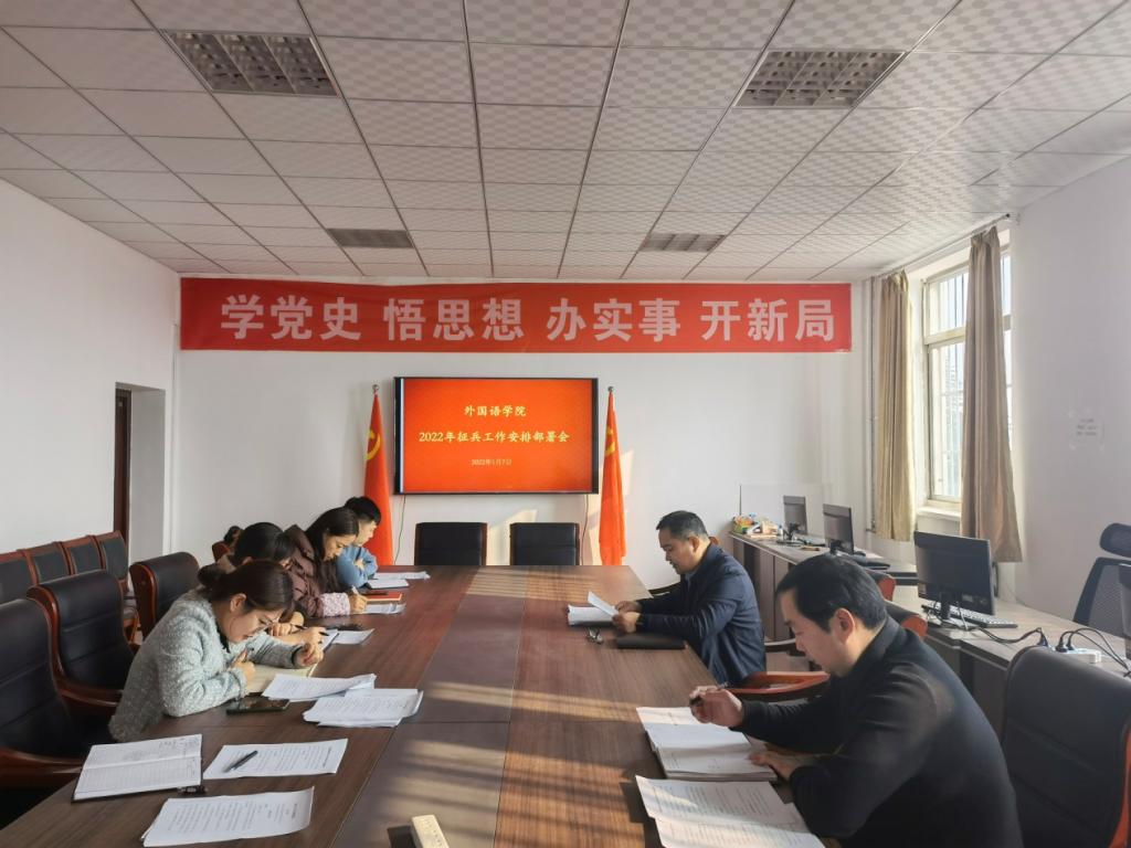 为深入贯彻落实习近平强军思想,激发广大学生的参军报国热情,营造良好的征兵工作氛围,切实推进学院征兵工作,近期,外国语学院在文科楼309室召开2022年征兵工作部署大会。全体辅导员老师参加此次会议,会议由党总支书记盛清银主持。