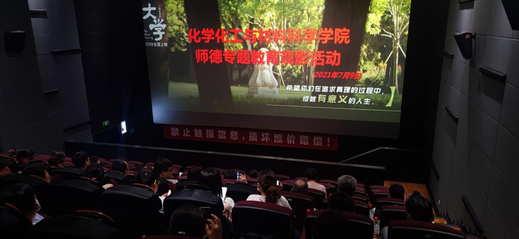 为深入开展师德专题教育,引导教师坚定理想信念、厚植爱国情怀,全面提升师德涵养,7月9日下午,化学化工与材料科学学院在中央广场东影时代影院组织全体教师观看电影纪录片《大学》。