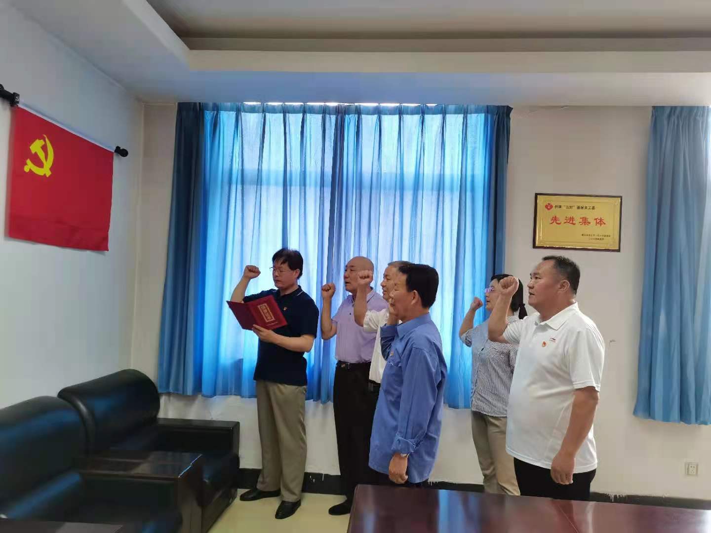活动中,郑付海带领老党员们重温入党誓词:“我志愿加入中国共产党,拥护党的纲领,遵守党的章程,履行党员义务,执行党的决定,严守党的纪律,保守党的秘密,对党忠诚,积极工作,为共产主义奋斗终生,随时准备为党和人民牺牲一切,永不叛党”。面对鲜红的党旗,大家个个精神饱满,热情高涨,用铿锵有力的宣誓声表达对党忠诚的决心。庄严的宣誓,践行了老党员们组织上入党,是一生一次;思想上入党,要一生一世的承诺。